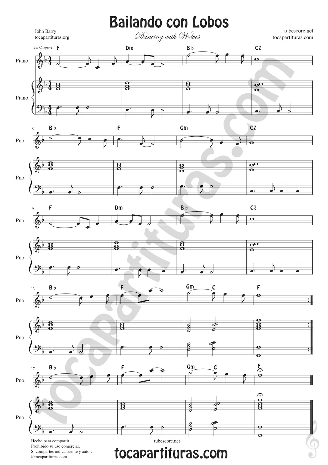 diegosax: Bailando con Lobos Partitura de Piano Fácil con ...