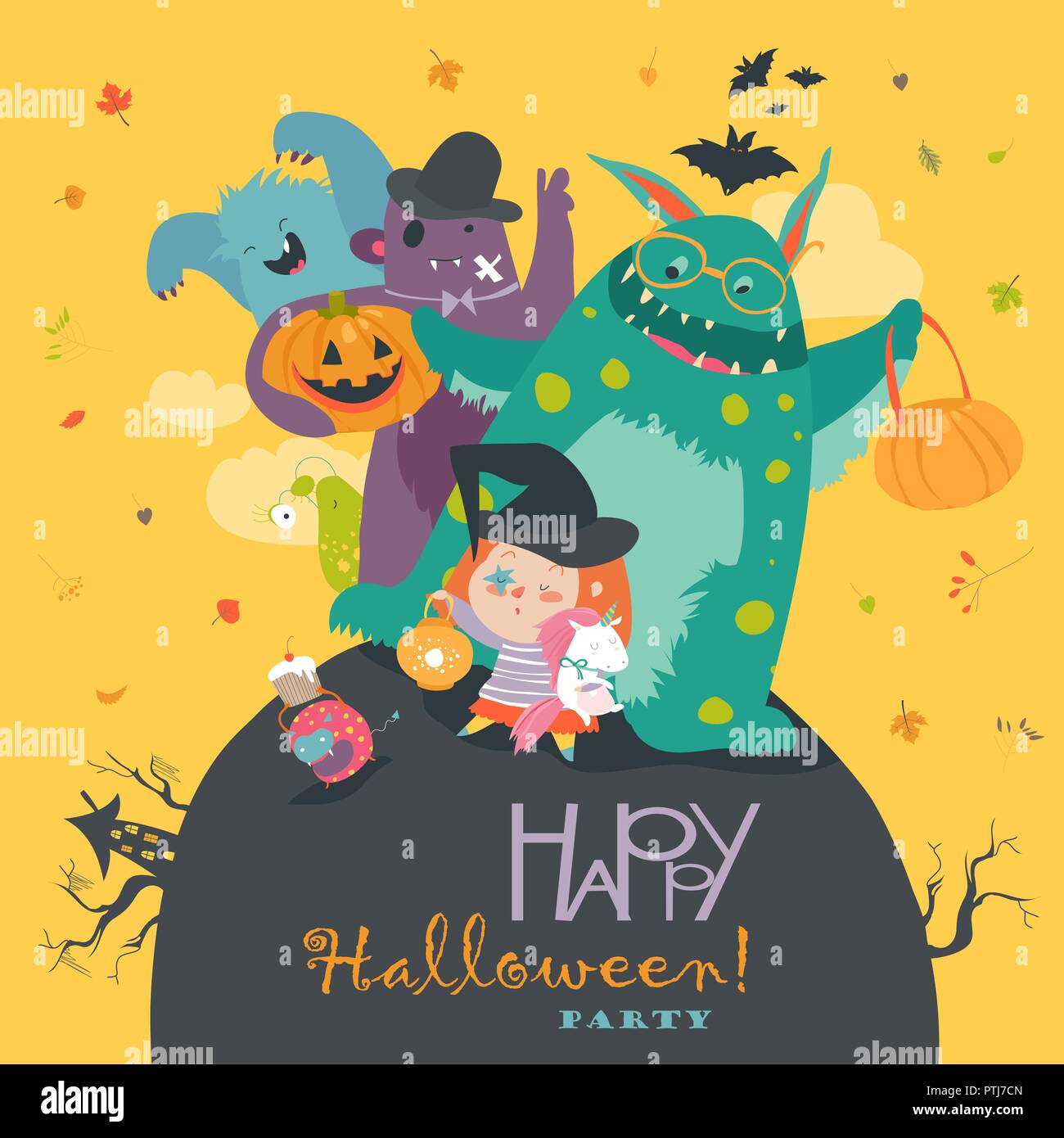 Cute girl with funny monsters. Halloween party Stock Vector Art ...