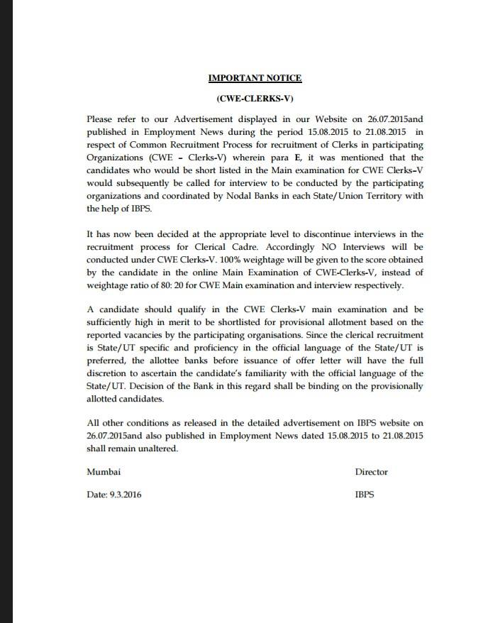 NO INTERVIEW IN IBPS CLERK - V : OFFICIAL NOTICE