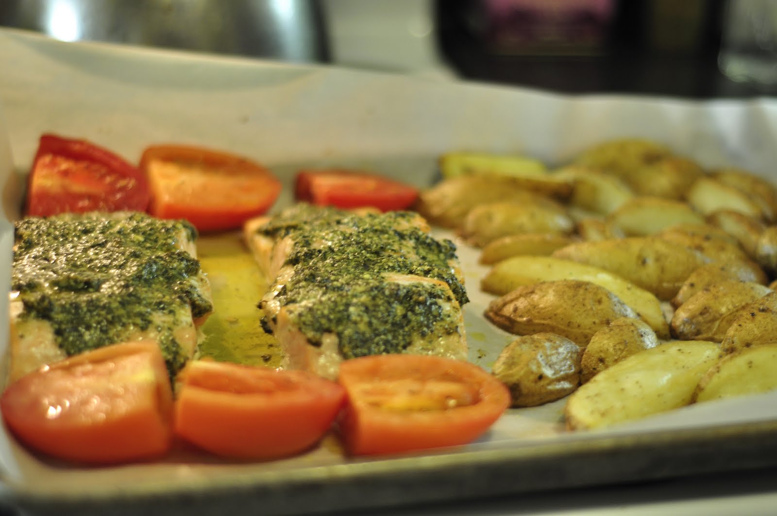 Pesto Salmon with Roasted Potatoes and Tomatoes | Homemade Mothering